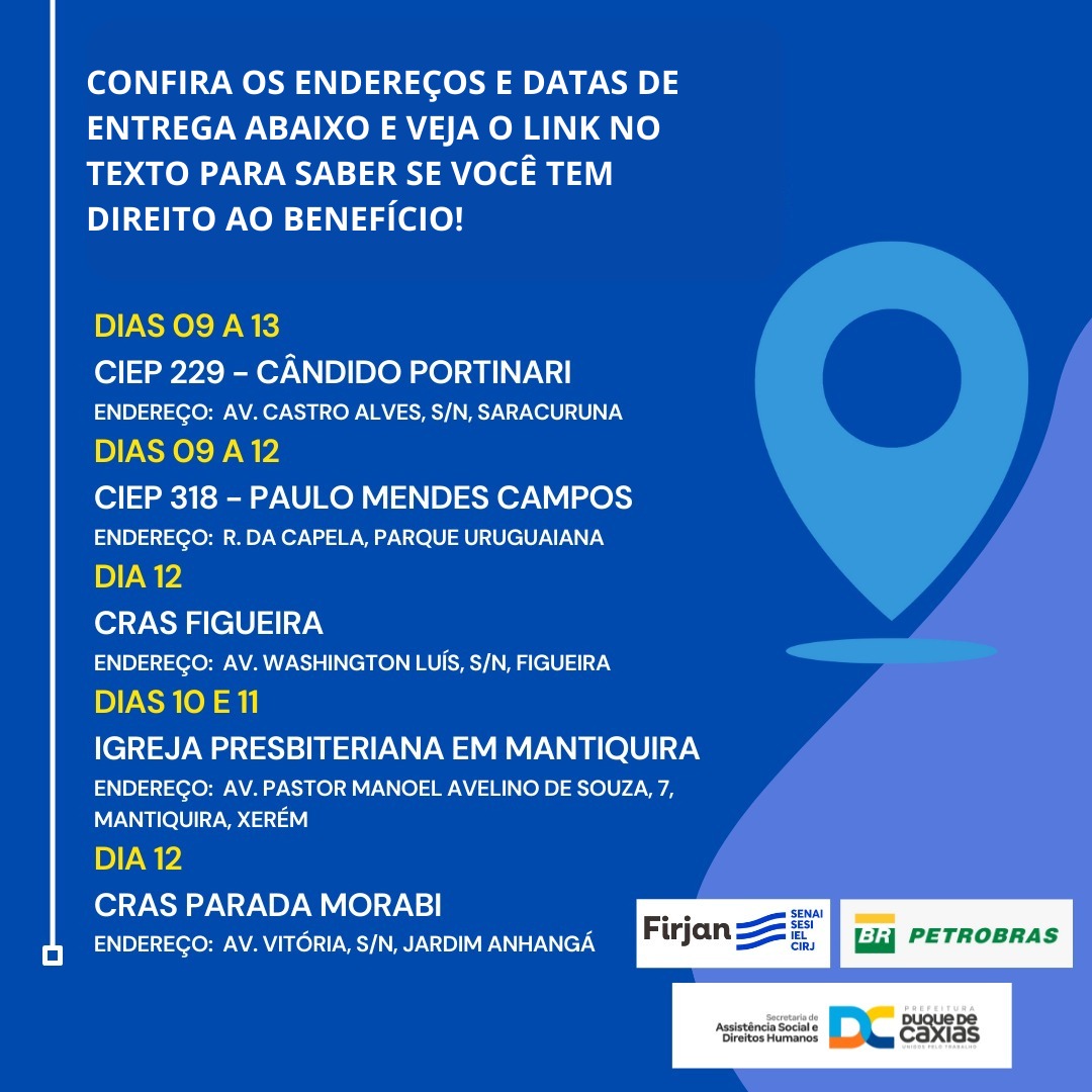As cestas são limitadas para cadastrados no CadÚnico e moradores dos seguintes bairros: Jardim Ana Clara, Jardim Primavera, Bom Retiro, Saracuruna, Cangulo, Vila Urussaí, Figueira, Mantiquira e Xerém.
