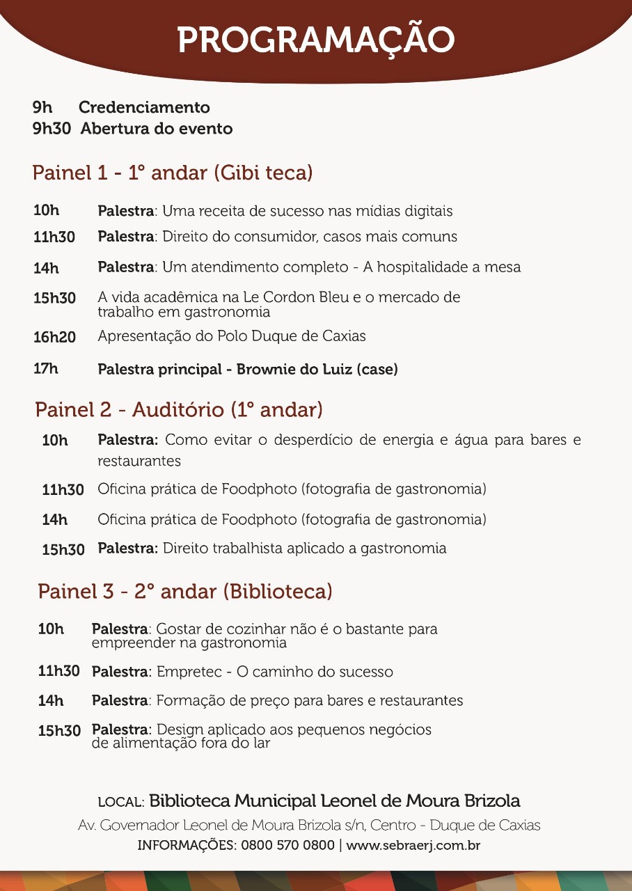 Duque de Caxias vai receber, no dia 23/10, mais uma edição do Fórum Gastronômico Sebrae na Mesa. O evento é mais uma parceria da Prefeitura de Duque de Caxias, através da Secretaria Municipal de Cultura e Turismo, e SEBRAE. O Fórum Gastronômico pretende reunir micro empreendedores individuais, micro e pequenos empresários e trabalhadores do segmento de alimentação fora do lar (restaurantes, bares, lanchonetes, padarias, buffets, docerias, entre outros), e também pessoas físicas interessadas pelo tema.