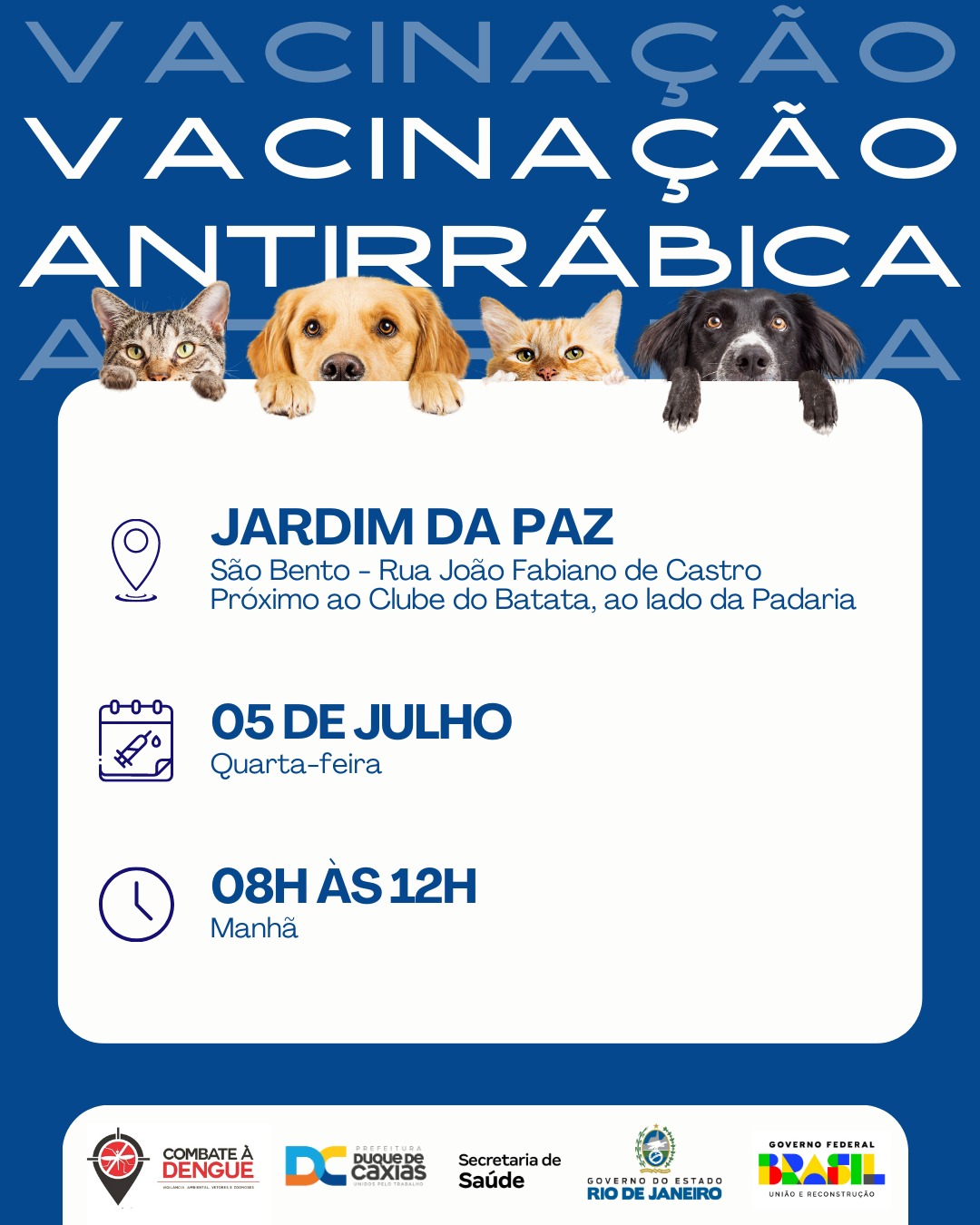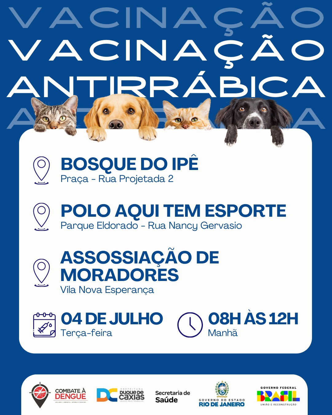Entre os dias 03 e 06 de julho, a Secretaria Municipal de Saúde de Duque de Caxias, através da Superintendência de Vigilância Ambiental, Vetores e Zoonoses (SVAVZ), estará com a campanha de Vacinação Antirrábica para cães e gatos nos bairros: Vinte e Cinco de Agosto, Imbariê, Bosque do Ipê, Parque Eldorado, Vila Nova Esperança, São Bento e Mangueirinha.