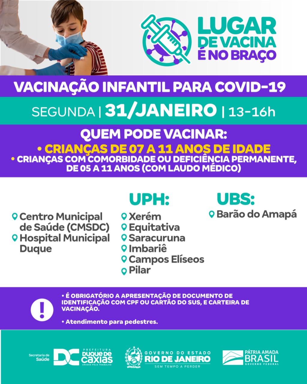 A Prefeitura de Duque de Caxias segue, nesta segunda-feira (31/01) com a vacinação infantil para crianças com idade de 07 a 11 anos e para aquelas com comorbidades ou deficiência permanente (de 5 a 11 anos), mediante a apresentação de laudo médico. A Secretaria Municipal de Saúde alerta aos responsáveis sobre a obrigatoriedade de levar documento de identificação com CPF ou Cartão do SUS da criança.