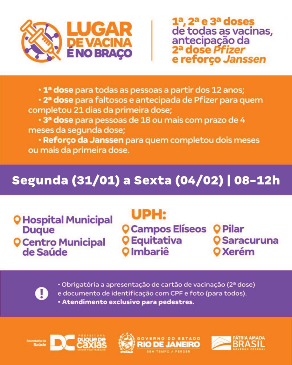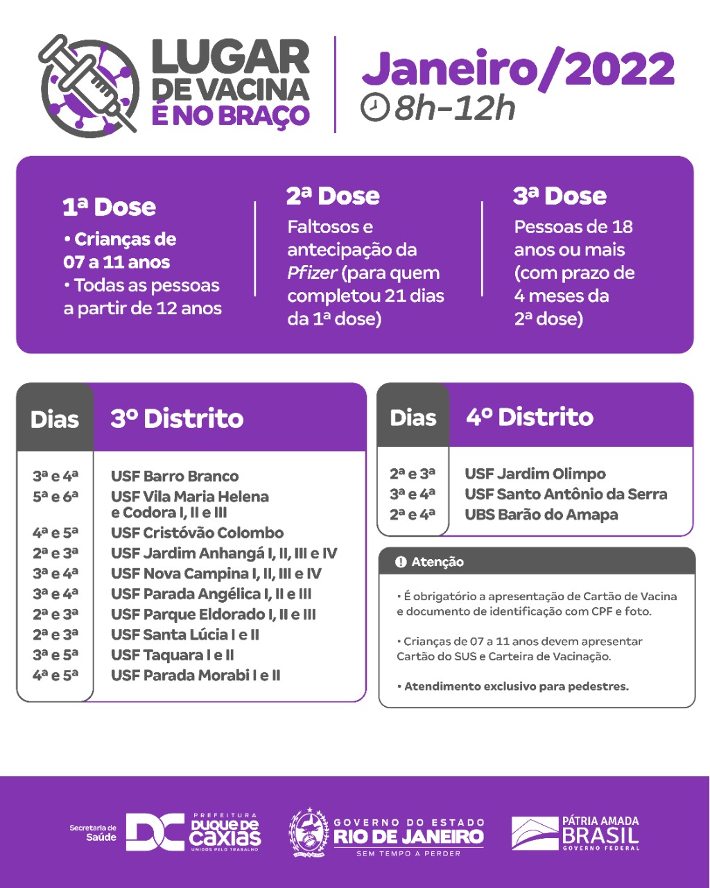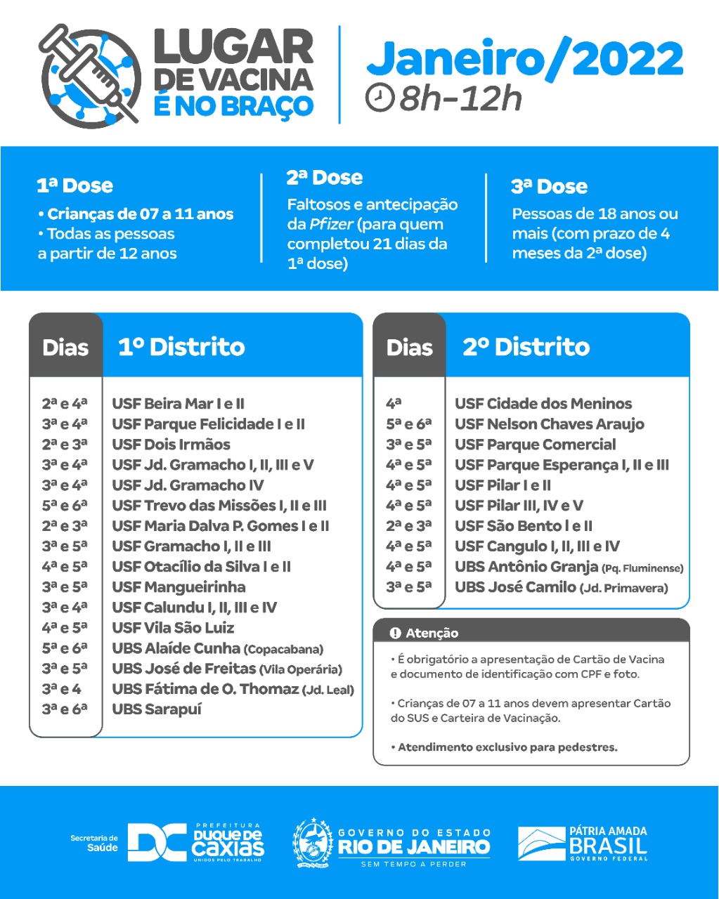 Vacinação contra a Covid-19 para adolescentes a partir de 12 anos e adultos - Duque de Caxias segue também com a aplicação de todas as doses da vacina contra a Covid-19, nas seguintes unidades, das 8h às 12h: Hospital Municipal Duque - Centri Municipal de Saúde (CMSDC) - UPH Campos Elíseos - UPH Equitativa - UPH Imbariê - UPH Pilar - UPH Saracuruna - UPH Xerém. As unidades da rede de Atenção Básica também disponibilizam as três doses da vacina, das 8h às 12h. (Veja a lista dessas unidades acessando o link no final da matéria).