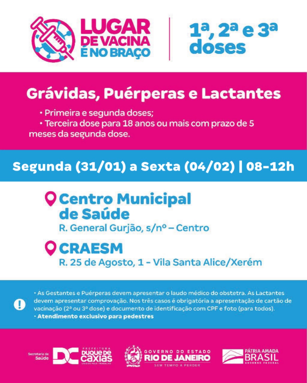 As Gestantes, Puérperas e Lactantes podem receber a primeira, segunda e terceira (para quem completou 5 meses da segunda dose) no Centro Municipal de Saúde (CMSDC) e no CRAESM de Xerém . As Gestantes e Puérperas devem apresentar o laudo médico do obstetra. As Lactantes devem apresentar comprovação. Nos três casos é obrigatória a apresentação de cartão de vacinação (segunda dose) e documento de identificação com CPF e foto.