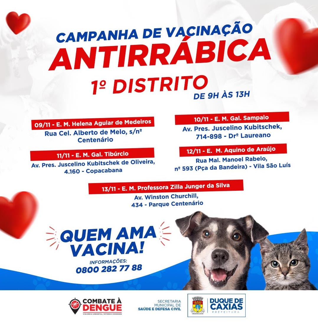 A Campanha de Vacinação Contra a Raiva Animal, promovida pela Prefeitura de Duque de Caxias, através da Secretaria Municipal de Saúde e Defesa Civil, segue sua programação semanal, entre os dias 09 e 13/11, no primeiro distrito. As equipes da Superintendência de Vigilância Ambiental, Vetores e Zoonoses estarão nos bairros Centenário, Drº Laureano, Copacabana e Vila São Luís, das 9h às 13h.