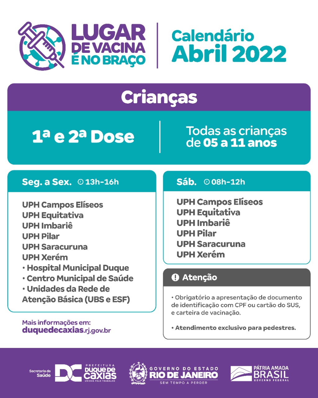 Obs: Aos sábados a vacinação infantil acontece das 8h às 12h, nas seis UPHs do município.