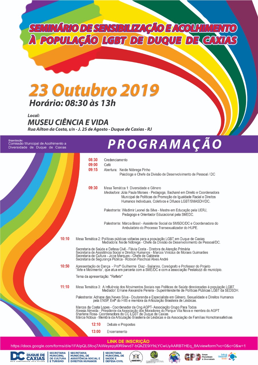 O Seminário de Sensibilização e Acolhimento à População LGBT de Duque de Caxias acontece no auditório do Museu Ciência e Vida, que fica localizado na Rua Ailton da Costa, s/nº – Jardim 25 de Agosto – DC.