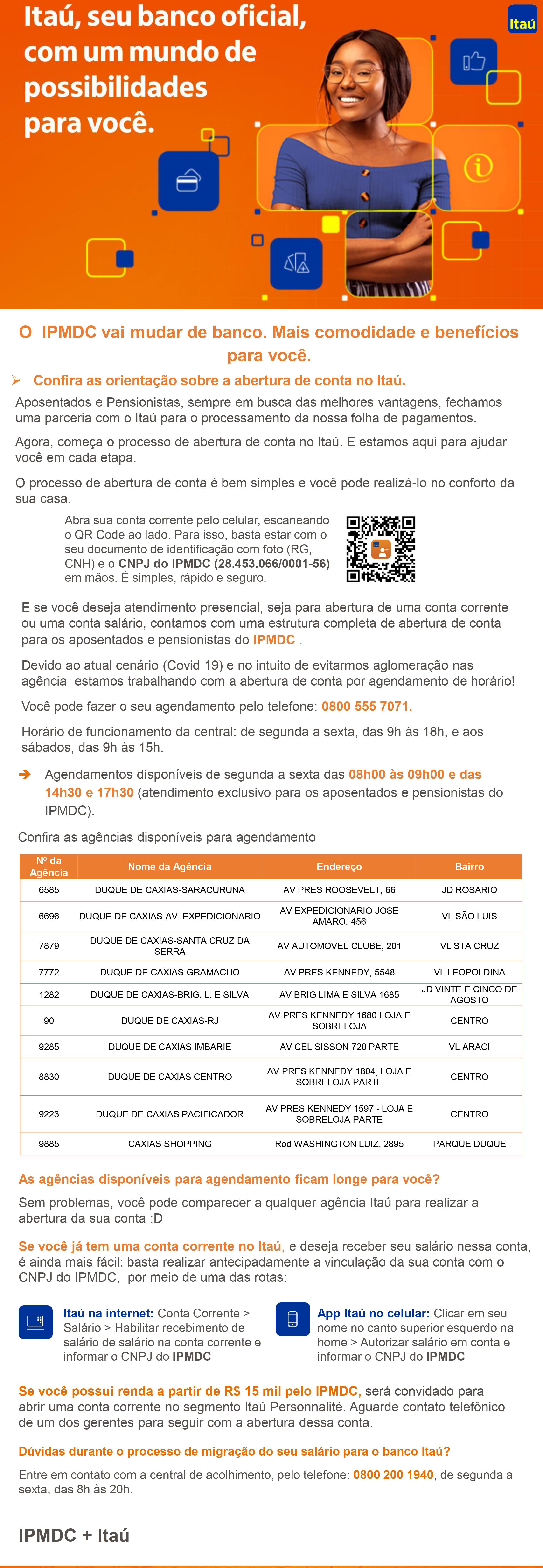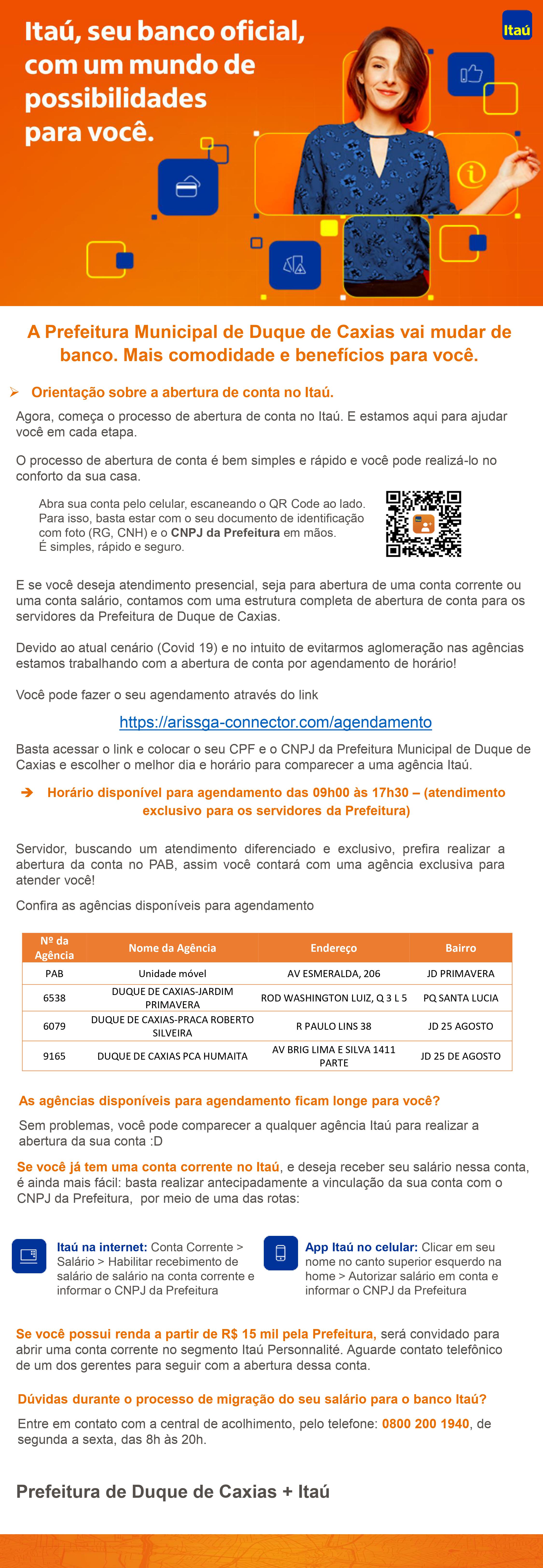 A nova instituição financeira que ficará encarregada da folha de pagamento dos servidores públicos municipais de Duque de Caxias será o Banco ITAÚ. Nesta etapa, os servidores ativos, aposentados e pensionistas podem optar em realizar o processo de abertura de conta pelo celular ou agendar o atendimento presencial em qualquer agência do banco ITAÚ. Durante o processo de migração do salário os servidores que tiverem dúvidas poderão entrar em contato com a Central de Acolhimento, pelo telefone 0800 200 1940, de segunda a sexta-feira, das 8h às 20h.