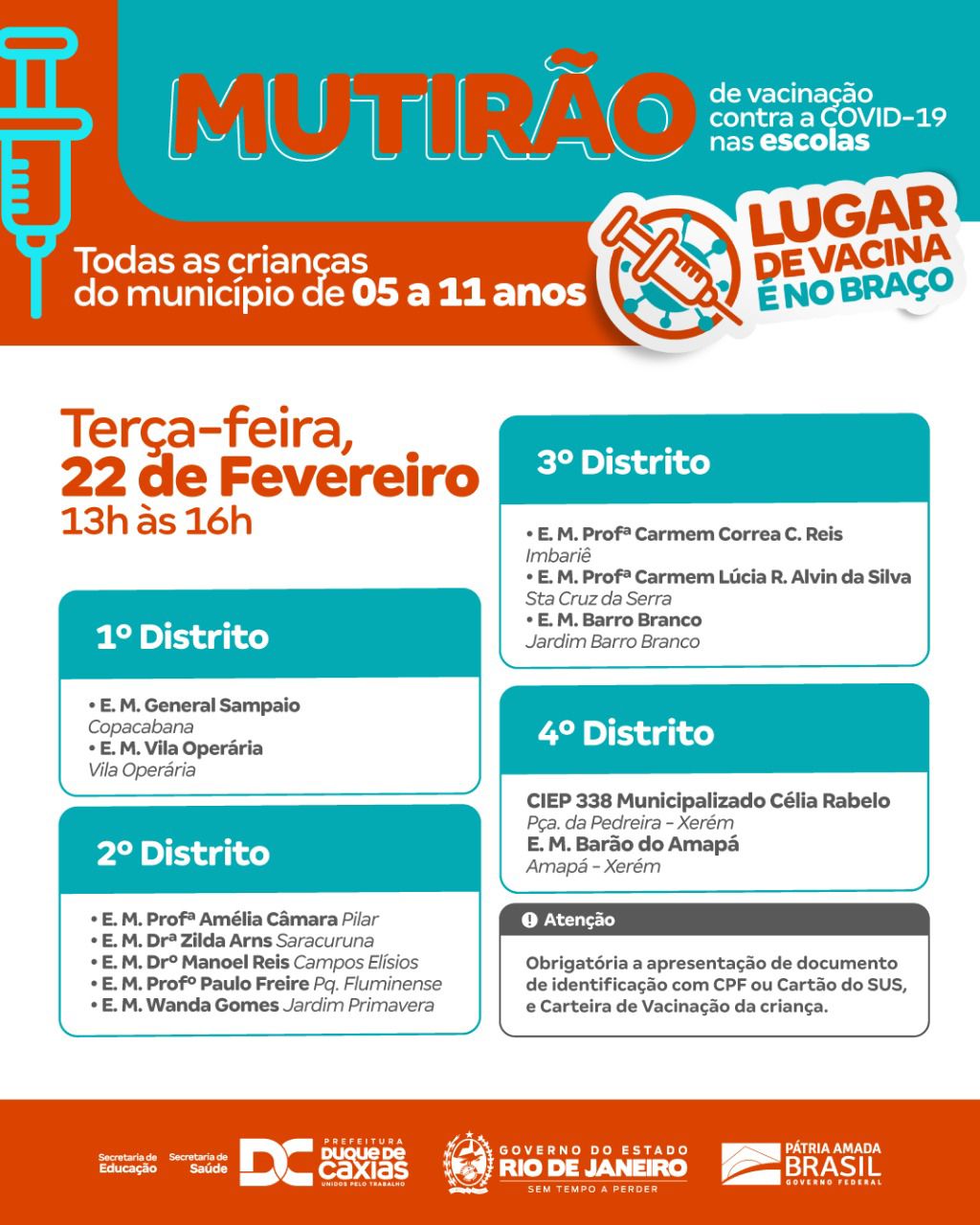 A Prefeitura de Duque de Caxias, através das secretarias municipais de Saúde e de Educação, promove nesta terça-feira (22/02), das 13h às 16h, mais um mutirão de vacinação infantil nas escolas da rede municipal. O objetivo da ação é incentivar a vacinação de todas as crianças, além de reforçar a segurança de alunos e profissionais de ensino na volta às aulas.