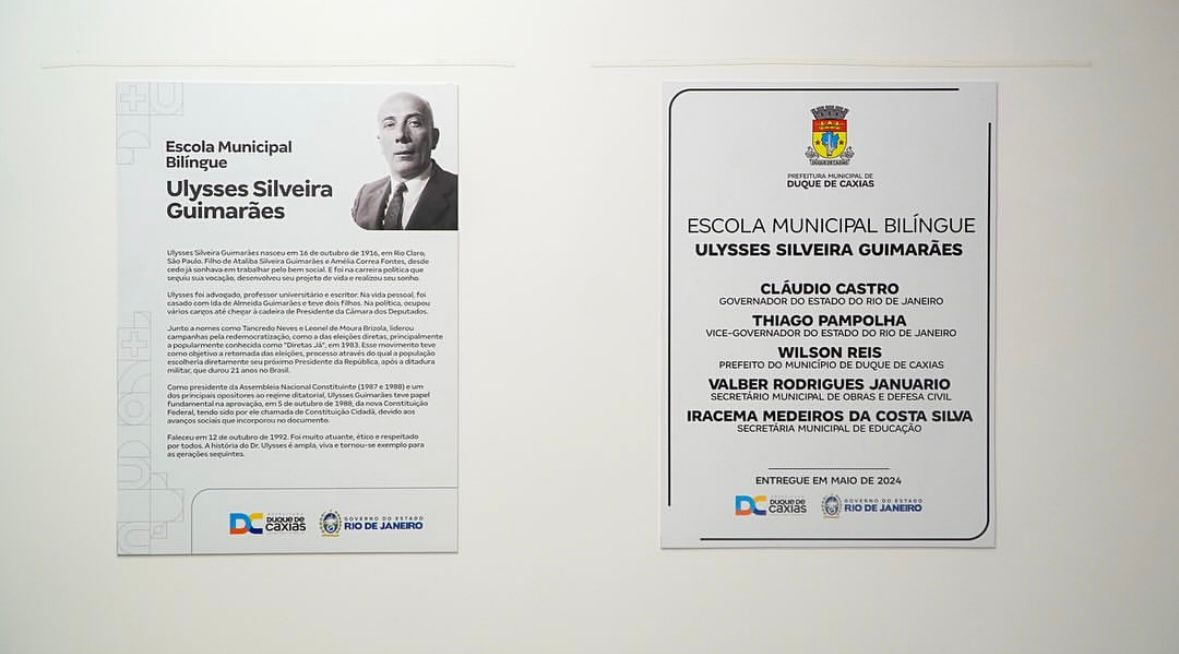 A Prefeitura de Duque de Caxias inaugurou, no último sábado (18), a terceira escola bilíngue da rede municipal, construída em parceria com o governo do estado. A nova escola fica localizada na Rua Almirante Cochrane, em Imbariê, no terceiro distrito. A unidade escolar ganhou o nome de Ulysses Silveira Guimarães, em homenagem ao deputado constituinte, terá ensino bilíngue com um programa especial para lecionar um segundo idioma de forma integrada, além de estar equipada para oferecer um ensino de qualidade.