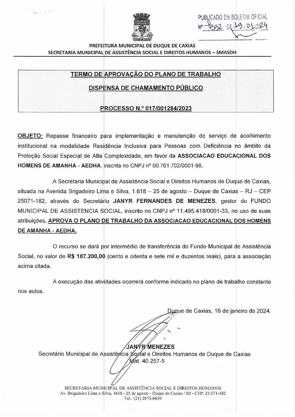 A Prefeitura de Duque de Caxias, através da Secretaria Municipal de Assistência Social e Direitos Humanos, com esteio na Lei nº 13.019, de 31 de julho de 2014 e Deliberação nº 277/2017 do Tribunal de Contas do Estado do Rio de Janeiro – TCE-RJ torna público a presente aprovação do plano de trabalho referente a Dispensa de Chamamento Público para implementação da Residência Inclusiva para pessoas com deficiência.