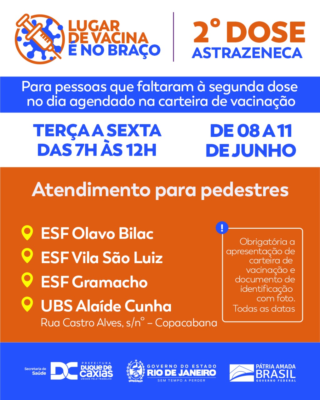 Na próxima segunda-feira (14), a Prefeitura promove o Mutirão da Segunda Dose (Astrazeneca e Coronavac), das 7h às 13h, na Vila Olímpica de Duque de Caxias (Bairro Vinte e Cinco de Agosto) para todos os faltosos.