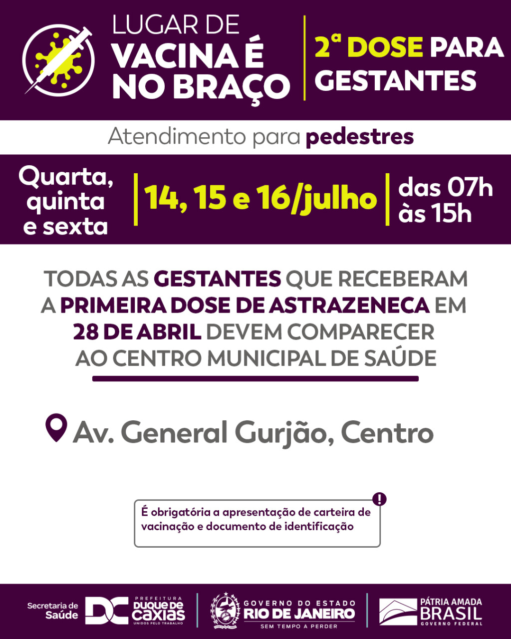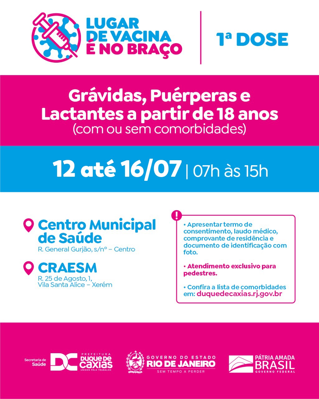O município de Duque de Caxias segue também com a aplicação da primeira dose da vacina contra a covid-19 para gestantes, puérperas e lactantes, com idade acima de 18 anos. A vacinação acontece de segunda a sexta-feira, das 7h às 15h, no CMSDC- Centro Municipal de Saúde (Av. General Gurjão – Centro) e no CRAESM de Xerém (Rua 25 de Agosto – Vila Santa Alice – Xerém). As gestantes e puérperas devem apresentar o laudo médico do obstetra. As lactantes devem apresentar comprovação. Nos três casos é obrigatório ainda a apresentação de documento de identificação e comprovante de residência.