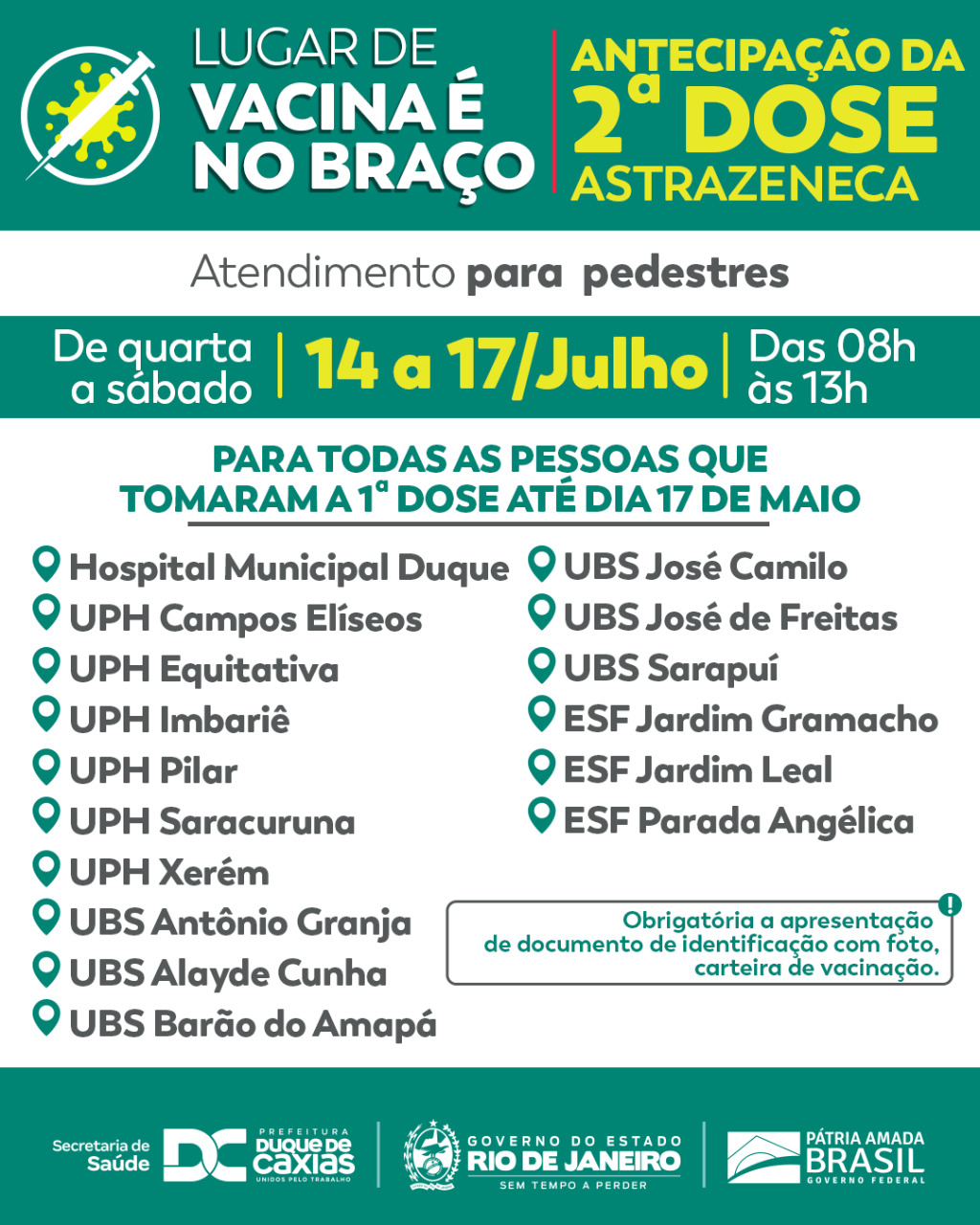 Nesta sexta-feira (16/07), a Secretaria Municipal de Saúde de Duque de Caxias disponibiliza 16 pontos de vacinação para aplicação da segunda dose antecipada da Astrazeneca, seguindo a recomendação do Governo do Estado que autoriza a redução do intervalo de aplicação da segunda dose da vacina de 12 para 8 semanas. A Secretaria alerta que somente poderão antecipar a segunda dose aquelas pessoas que receberam a primeira dose de Astrazeneca antes do dia 17/05, completando assim o prazo mínimo de 8 semanas recomendado pela SES-RJ. Lembrando que é obrigatória a apresentação do cartão de vacinação e documento de identificação.