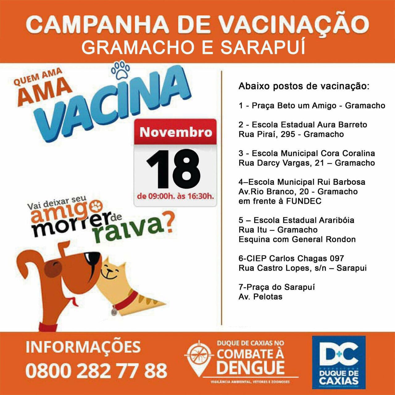 A Prefeitura de Duque de Caxias, através da Coordenaria Municipal de Vigilância Ambiental e Zoonoses, realiza neste sábado, 18/11, mais uma etapa da campanha de vacinação contra a raiva animal no primeiro distrito. Desta vez a ação vai imunizar cães e gatos nos bairros Gramacho, Sarapuí e comunidades vizinhas. Para atender a demanda da região, sete postos de vacinação estarão funcionando, das 9h às 16h30. A vacinação é gratuita.