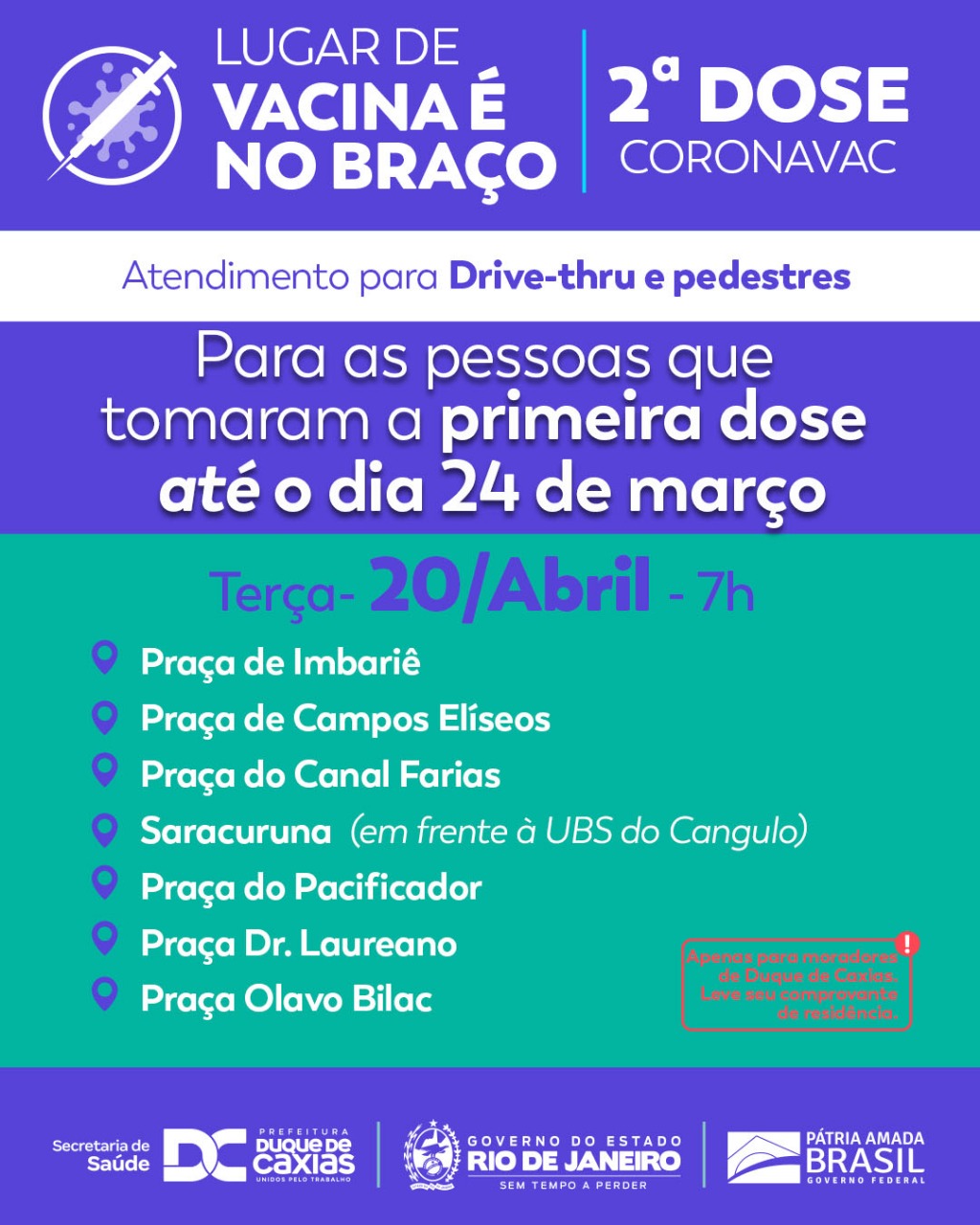 A Prefeitura de Duque de Caxias segue nesta terça-feira (20/04) a aplicação da primeira e da segunda dose em diversos pontos de vacinação, a partir das 7h. A Secretaria Municipal de Saúde vai aplicar a primeira dose da vacina Oxford/Astrazeneca para pessoas com 59 anos ou mais em sete tendas montadas em diferentes bairros. Já a segunda dose da Coronavac será aplicada em outros sete locais somente nas pessoas que tomaram a primeira dose até o dia 24 de março.