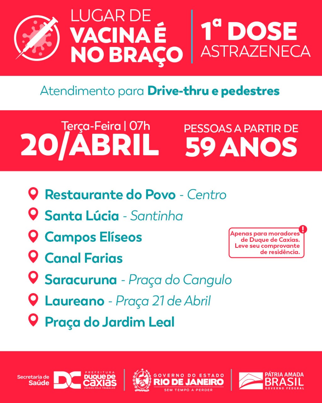 Os locais de vacinação em Duque de Caxias nesta terça-feira (20/04) serão: