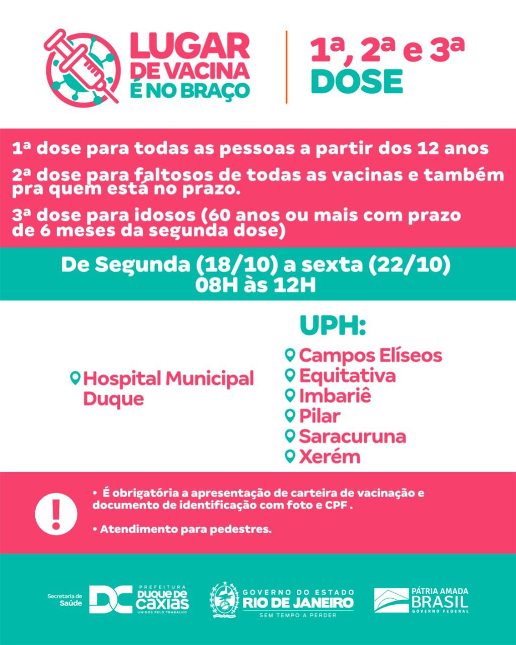 A vacinação ocorrerá no Hospital Municipal Duque, UPH Campos Elíseos, UPH Equitativa, UPH Imbariê, UPH Pilar, UPH Saracuruna, e UPH Xerém. No ato da vacinação, é obrigatória a apresentação de carteira de vacinação e documentos de identificação com CPF e foto. O atendimento será para pedestres.