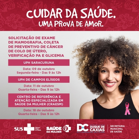 A Prefeitura de Duque de Caxias, através da Secretaria Municipal de Saúde (SMS), preparou ações voltadas para a Campanha Outubro Rosa, de conscientização e prevenção ao Câncer de Mama, para as mulheres do município..