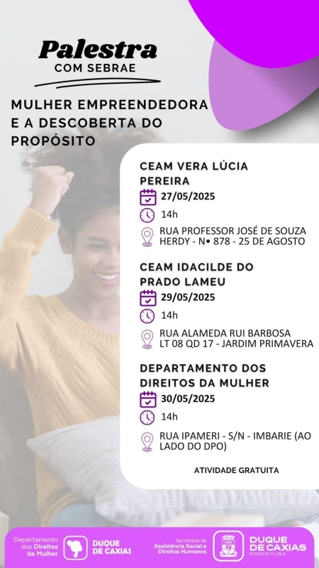 A Secretaria de Assistência Social e Direitos Humanos de Duque de Caxias, em parceria com o Sebrae, promoverá entre os dias 27 e 30 de maio uma série de palestras com o tema “Mulher Empreendedora e a Descoberta do Propósito”. A primeira palestra ocorrerá nesta terça-feira, 27/05, às 14h, no Centro Especializado de Atendimento à Mulher Vera Lúcia Pereira, situado na Rua Professor José de Souza Herdy, nº 878, bairro 25 de Agosto. No dia 29/05, também às 14h, a programação segue no CEAM Idalcide do Prado Lomeu, na Alameda Rui Barbosa, Lote 08, Quadra 17, no Jardim Primavera. A última palestra será realizada em 30/05, às 14h, no Departamento dos Direitos da Mulher, localizado na Rua Ipameri, s/nº, Imbariê, ao lado do DPO..