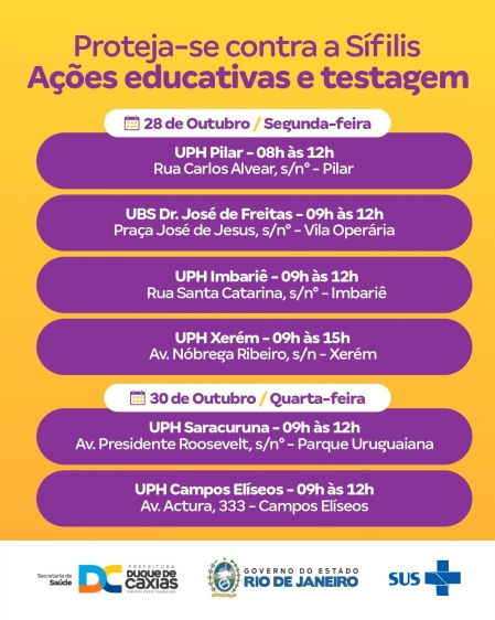 A Prefeitura de Duque de Caxias, através da Secretaria Municipal de Saúde, por meio do Departamento de Vigilância em Saúde (DVS) e Programa IST/AIDS e Hepatite Virais, divulga calendário de ações programadas para marcar o Dia Nacional de Combate à Sífilis e à Sífilis Congênita, uma Infecção Sexualmente Transmissível (IST), comemorado no terceiro sábado do mês de outubro. .