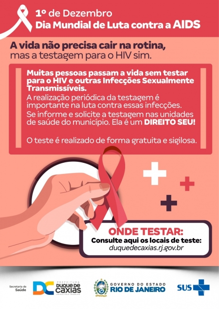 No dia 01 de dezembro é celebrado o Dia Mundial da Luta Contra a Aids. Para marcar a data, a Secretaria Municipal de Saúde de Duque de Caxias promoverá, no decorrer de todo o mês, denominado “Dezembro Vermelho”, campanhas educativas de conscientização e de testagem para o HIV nas unidades de saúde do município, com o apoio do Programa Municipal de IST/AIDS e Hepatites Virais da SMS. .