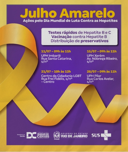 A Secretaria Municipal de Saúde de Duque de Caxias promove, durante o mês de julho, ações pelo Dia Mundial de Luta Contra as Hepatites, celebrado no dia 28/07, através do Programa Municipal de IST/AIDS e Hepatites Virais. As iniciativas fazem parte do Julho Amarelo e seguem o calendário abaixo: .