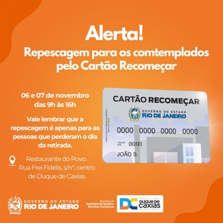 A Prefeitura de Duque de Caxias, através da Secretaria Municipal de Assistência Social e Direitos Humanos, vai realizar a entrega dos cartões nesa quarta-feira (06) e quinta-feira (07), das 9h às 16h, no Restaurante do Povo, localizado na Rua Frei Fidélis,s/nº. .