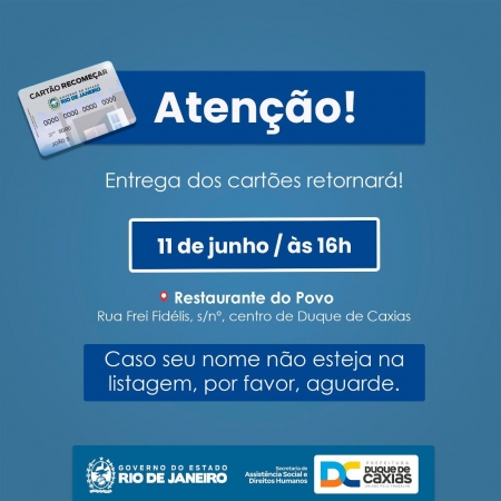 A Prefeitura de Duque de Caxias, através da Secretaria Municipal de Assistência Social e Direitos Humanos, informa que as entregas do Cartão Recomeçar continuam nesta terça-feira, dia 11 de junho, às 16h, no Restaurante do Povo, localizado na Rua Frei Fidélis, nº 501, centro do município. .