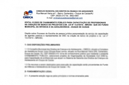 O Conselho Municipal dos Direitos da Criança e do Adolescente de Duque de Caxias – CMDCA/DC, por intermédio da Secretaria Municipal de Assistência Social e Direitos Humanos - SMASDH, com esteio na Lei nº 13.019, de 31 de julho de 2014 e Deliberação nº 277/2017 do Tribunal de Contas do Estado do Rio de Janeiro – TCE-RJ torna público o presente Edital de Chamamento Público nº 01/2023, visando à celebração de parceria com OSC para prestação de serviço no seguimento de capacitação e qualificação para os agentes públicos do Conselho Municipal dos Direitos da Criança e do Adolescente - CMDCA e todas as OSC inscritas no referido conselho, com vistas a aprimorar os conhecimentos de gestão técnicos e práticos na formalização dos termos de colaboração, fomento e acordo de cooperação, nas condições devidamente caracterizadas e especificadas no edital. .