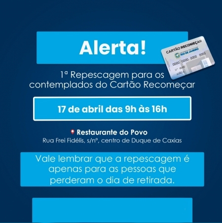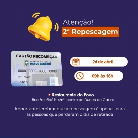 A Prefeitura de Duque de Caxias, através da Secretaria Municipal de Assistência Social e Direitos Humanos, realiza, nesta quarta-feira (24/04), a segunda "repescagem" para retirada do Cartão Recomeçar. O cartão só poderá ser retirado mediante apresentação de documento original com foto e cópia do mesmo, além de CPF e comprovante de residência. A entrega acontece das 9h às 16h, no Restaurante do Povo, localizado na Rua Frei Fidélis, nº 501. .