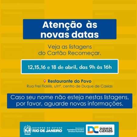 A Prefeitura de Duque de Caxias, através da Secretaria Municipal de Assistência Social e Direitos Humanos, informa que as entregas vão acontecer nos dias 12,15,16 e 18 de abril, das 9h às 16h, no Restaurante do Povo, no centro de Duque de Caxias. Verifique na listagem em qual dessas datas seu nome aparece e compareça para retirar o cartão. .