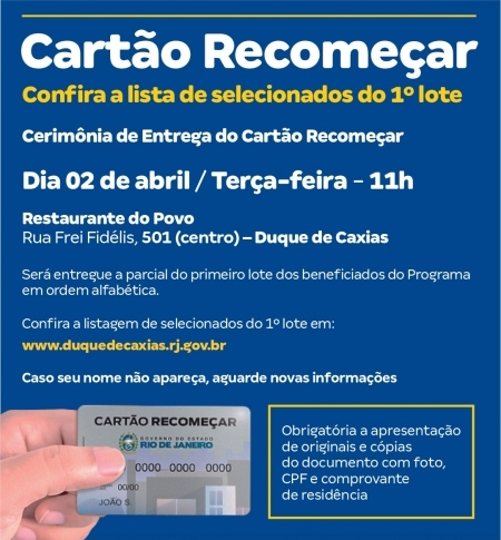 Nesta terça-feira (02/04), o Governo do Estado do Rio de Janeiro, através da Prefeitura de Duque de Caxias e a Secretaria Municipal de Assistência Social e Direitos Humanos, realizará, às 11h, no Restaurante do Povo, a cerimônia de entrega do Cartão Recomeçar. Na ocasião, será entregue a parcial do primeiro lote dos beneficiados do programa de forma alfabética. Vale destacar que o Cartão Recomeçar será entregue mediante a apresentação de originais e cópias do documento oficial com foto, CPF e comprovante de residência. .