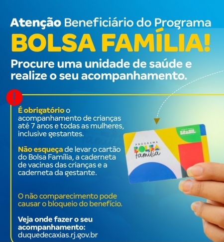 A Prefeitura de Duque de Caxias, através das Secretarias Municipais de Saúde (SMS) e de Assistência Social e Direitos Humanos (SMASDH), convoca os beneficiários do Programa Bolsa Família para o primeiro acompanhamento nas unidades de Saúde do ano de 2024, que vai do período de janeiro a junho. .