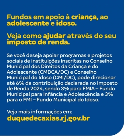 A Prefeitura de Duque de Caxias, através da Secretaria Municipal de Assistência Social e Direitos Humanos (SMASDH), está orientando os contribuintes que desejarem apoiar programas e projetos sociais desenvolvidos por instituições inscritas no Conselho Municipal dos Direitos da Criança e do Adolescente (CMDCA/DC) e Conselho Municipal do Idoso (CMI/DC), a direcionar até 6% da contribuição declarada no Imposto de Renda 2024, sendo 3% para FMIA – Fundo Municipal para Infância e Adolescência e 3% para o FMI – Fundo Municipal do Idoso. O prazo para entrega da declaração vai até o dia 31/05/2024. .