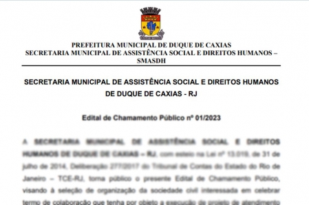 A Prefeitura de Duque de Caxias, através da Secretaria Municipal de Assistência Social e Direitos Humanos, com esteio na Lei no 13.019, de 31 de julho de 2014, Deliberação 277/2017 do Tribunal de Contas do Estado do Rio de Janeiro – TCE-RJ, torna público o presente Edital de Chamamento Público nº 01/2023, visando à seleção de até 21 (vinte e uma) organizações da sociedade civil, interessadas em celebrarem termo de colaboração que tenham por objeto a execução de projeto de atendimento aos indivíduos e das famílias usuárias da Política de Assistência Social executadas pelas equipes técnicas da Secretaria Municipal de Assistência Social e Direitos Humanos, nas condições devidamente caracterizadas e especificadas no edital. .