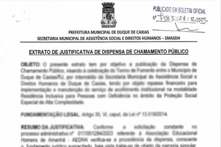 A Prefeitura de Duque de Caxias, através da Secretaria Municipal de Assistência Social e Direitos Humanos, com esteio na Lei nº 13.019, de 31 de julho de 2014 e Deliberação nº 277/2017 do Tribunal de Contas do Estado do Rio de Janeiro – TCE-RJ torna público o presente Extrato de Justificativa de Dispensa de Chamamento Público para implementação da Residência Inclusiva para pessoas com deficiência..