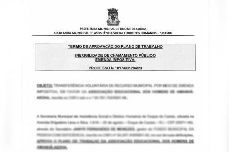 A Prefeitura de Duque de Caxias, através da Secretaria Municipal de Assistência Social e Direitos Humanos, com esteio na Lei nº 13.019, de 31 de julho de 2014 e Deliberação nº 277/2017 do Tribunal de Contas do Estado do Rio de Janeiro – TCE-RJ torna público o presente Termo de Aprovação do Plano de Trabalho de Inexigibilidade de Chamamento Público, oriundo da Emenda Impositiva. .