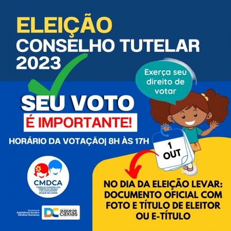 A Secretaria Municipal de Assistência Social e Direitos Humanos, através do Conselho Municipal dos Direitos da Criança e do Adolescente (CMDCA), vai promover a eleição unificada para escolha de conselheiros tutelares, nos quatro distritos, no primeiro domingo de outubro (01), no município de Duque de Caxias..