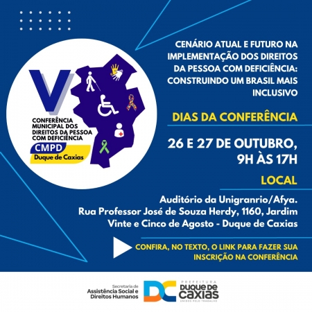 A Prefeitura de Duque de Caxias, através da Secretaria Municipal de Assistência Social e Direitos Humanos e do Conselho Municipal dos Direitos da Pessoa com Deficiência, promoverá, nos dias 26 e 27/10, das 9h às 17h, a V Conferência Municipal dos Direitos da Pessoa com Deficiência, no auditório da Universidade Unigranrio..
