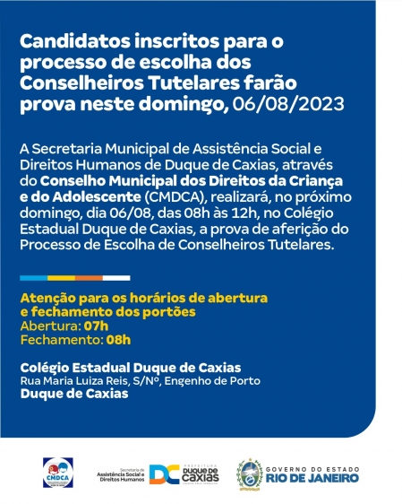 A Secretaria Municipal de Assistência Social e Direitos Humanos de Duque de Caxias, através do Conselho Municipal dos Direitos da Criança e do Adolescente (CMDCA), realizará, no próximo domingo, dia 06/08, das 8h às 12h, no Colégio Estadual Duque de Caxias, a prova de aferição do Processo de Escolha de Conselheiros Tutelares. As disciplinas abordadas no certame são sobre conhecimentos específicos do Estatuto da Criança e do Adolescente, Língua Portuguesa e Redação, com caráter eliminatório, sob a responsabilidade do Conselho e fiscalização do Ministério Público..