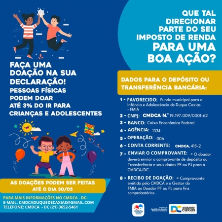 A Prefeitura de Duque de Caxias, através da Secretaria Municipal de Assistência Social e Direitos Humanos (SMASDH), está orientando os contribuintes que desejam apoiar programas e projetos desenvolvidos por instituições inscritas no Conselho Municipal dos Direitos da Criança e do Adolescente (CMDCA/DC) a direcionar até 3% da contribuição declarada no Imposto de Renda 2023 para esse fim. O prazo para entrega da declaração vai até o dia 30/05..