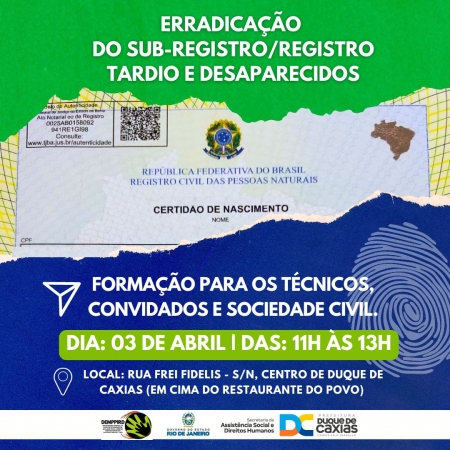 A Prefeitura de Duque de Caxias, através da Secretaria Municipal de Assistência Social e Direitos Humanos de Duque de Caxias, promoverá , amanhã (03), às 11 h, uma formação para a erradicação do sub-registro, registro tardio e desaparecidos, no auditório do Centro de Cidadania LGBT, localizado na Rua Frei Fidélis, s/nº. .