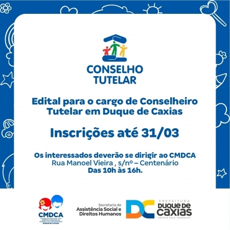 A Secretaria Municipal de Assistência Social e Direitos Humanos, através do Conselho Municipal dos Direitos da Criança e do Adolescente, CMDCA de Duque de Caxias, publicou o edital para o cargo de Conselheiro Tutelar no município. De acordo com o documento, o período para inscrição de candidatos começou no dia 27/02, e segue até o dia 31/03..