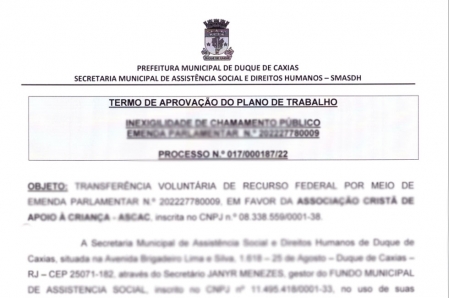 A Prefeitura de Duque de Caxias, através da Secretaria Municipal de Assistência Social e Direitos Humanos, com esteio na Lei nº 13.019, de 31 de julho de 2014 e Deliberação nº 277/2017 do Tribunal de Contas do Estado do Rio de Janeiro – TCE-RJ torna público o presente Termo de Aprovação do Plano de Trabalho de Inexigibilidade de Chamamento Público, oriundo da Emenda Parlamentar 330170220210003. .