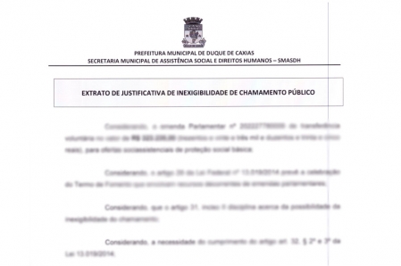 A Prefeitura de Duque de Caxias, através da Secretaria Municipal de Assistência Social e Direitos Humanos, com esteio na Lei nº 13.019, de 31 de julho de 2014 e Deliberação nº 277/2017 do Tribunal de Contas do Estado do Rio de Janeiro – TCE-RJ, torna público o presente Extrato de Justificativa de Inexigibilidade de Chamamento Público, oriundo da Emenda Parlamentar. .