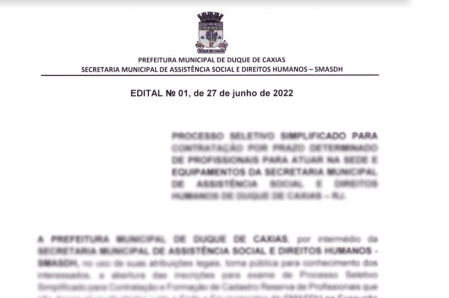 A Prefeitura de Duque de Caxias, através da Secretaria Municipal de Assistência Social e Direitos Humanos - SMASDH, divulgar o edital para o processo seletivo simplificado para seleção de candidatos à contratação temporária e formação de cadastro reserva, a fim de atender as demandas da SMASDH/DC, em seus equipamentos nos quatro distritos da cidade. .