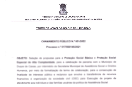 A SECRETARIA MUNICIPAL DE ASSISTÊNCIA SOCIAL E DIREITOS HUMANOS DE DUQUE DE CAXIAS – RJ, com esteio na Lei no 13.019, de 31 de julho de 2014, Deliberação 277/2017 do Tribunal de Contas do Estado do Rio de Janeiro – TCE-RJ, torna público o resultado definitivo do chamamento público nº 001/2022, de acordo com a lei nº 13.019, de 31 de julho de 2014. O procedimento adotado pela PMDC tem por objetivo a seleção e a organização da sociedade civil interessada em celebrar o termo de colaboração. .