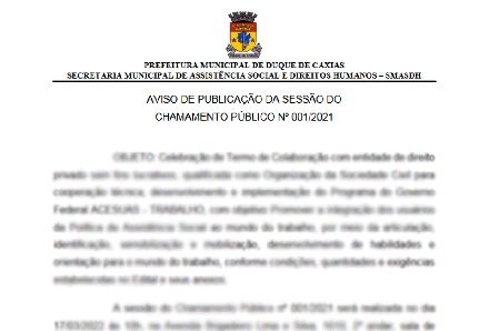 A Prefeitura de Duque de Caxias, através da Secretaria Municipal de Assistência Social e Direitos Humanos, divulga a realização da sessão de Chamamento Público nº 001/2021, referente ao Programa do Governo Federal ACESSUAS - Trabalho, cujo objetivo é de promover a integração dos usuários da política de assistência social ao mundo do trabalho no município de Duque de Caxias. .