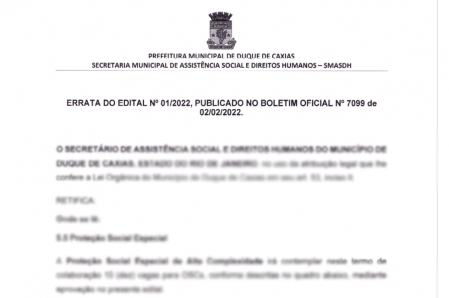 A Prefeitura de Duque de Caxias, através da Secretaria Municipal de Assistência Social e Direitos Humanos, com esteio na Lei no 13.019, de 31 de julho de 2014, Deliberação 277/2017 do Tribunal de Contas do Estado do Rio de Janeiro – TCE-RJ, torna público a Errata do Edital de Chamamento Público nº 01/2022, visando à seleção de organizações da sociedade civil, interessadas em celebrarem termo de colaboração com a Secretaria Municipal de Assistência Social e Direitos Humanos, nas condições devidamente caracterizadas e especificadas no edital. .
