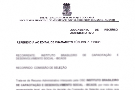 A SECRETARIA MUNICIPAL DE ASSISTÊNCIA SOCIAL E DIREITOS HUMANOS DE DUQUE DE CAXIAS – RJ, com esteio na Lei no 13.019, de 31 de julho de 2014, Deliberação 277/2017 do Tribunal de Contas do Estado do Rio de Janeiro – TCE-RJ, torna público o resultado do julgamento do recurso interposto pelo Instituto Brasileiro de Capacitação e Desenvolvimento Social - IBCADS, inscrita no CNPJ sob o nº 08.729.512/0001-03, referente ao chamamento público n.º 001/2021..