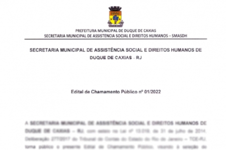 A Prefeitura de Duque de Caxias, através da Secretaria Municipal de Assistência Social e Direitos Humanos, com esteio na Lei no 13.019, de 31 de julho de 2014, Deliberação 277/2017 do Tribunal de Contas do Estado do Rio de Janeiro – TCE-RJ, torna público o presente Edital de Chamamento Público nº 01/2022, visando à seleção de até 15 (quinze) organizações da sociedade civil, interessadas em celebrarem termo de colaboração que tenham por objeto a execução de projeto de atendimento aos indivíduos e das famílias usuárias da Política de Assistência Social executadas pelas equipes técnicas da Secretaria Municipal de Assistência Social e Direitos Humanos, nas condições devidamente caracterizadas e especificadas no edital. .
